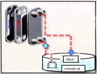 We are using the chemical which produced by Jiwon Tech, Co, Ltd. from Korea. There is several types of chemical with different application based on type of heat exchanger and material of heat exchanger.